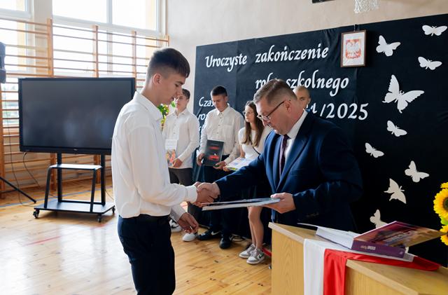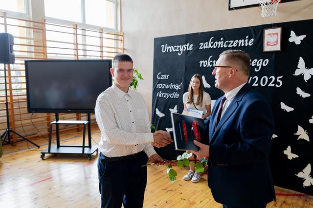 W dalszej części Dyrektor Stanisław Kłaniecki w asyście wicedyrektor Arlety Szustakiewicz uhonorowali Huberta Wiśniewskiego z klasy 2 Technikum, który spełnił kryteria w celu ubiegania się o Stypendium Prezesa Rady Ministrów na rok szkolny 2025/2026.