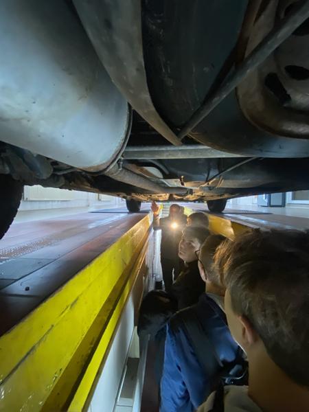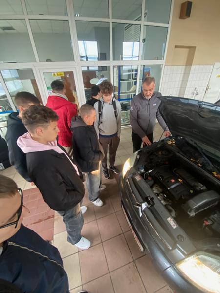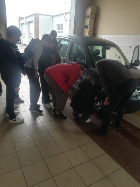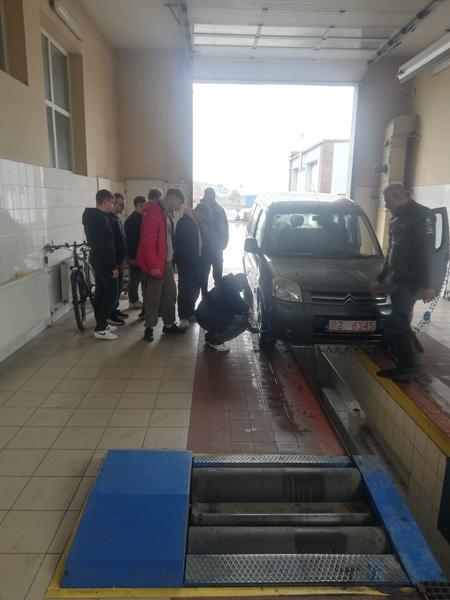 Po części teoretycznej, uczniowie obserwowali rzeczywisty proces badania technicznego samochodu, przeprowadzany w ramach okresowego przeglądu technicznego pojazdu.