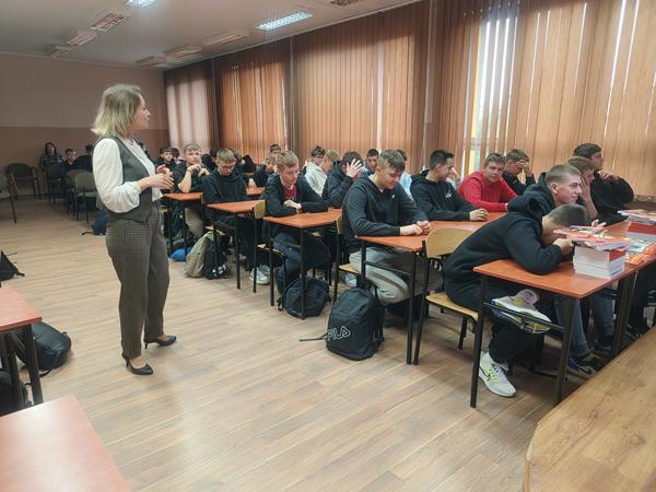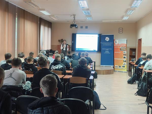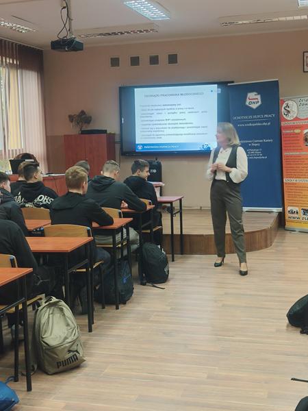 Prelegentką spotkania była mgr inż. Agnieszka Smykowska – przedstawicielka Państwowej Inspekcji Pracy, która w przystępny i interesujący sposób przybliżyła młodzieży istotne kwestie związane z prawami i obowiązkami młodocianych pracowników.