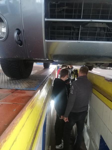 Po części teoretycznej, uczniowie obserwowali rzeczywisty proces badania technicznego samochodu, przeprowadzany w ramach okresowego przeglądu technicznego pojazdu.