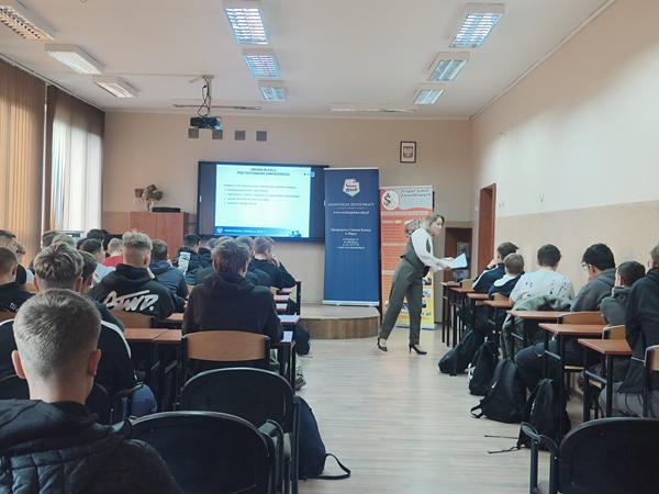 Prelegentką spotkania była mgr inż. Agnieszka Smykowska – przedstawicielka Państwowej Inspekcji Pracy, która w przystępny i interesujący sposób przybliżyła młodzieży istotne kwestie związane z prawami i obowiązkami młodocianych pracowników.