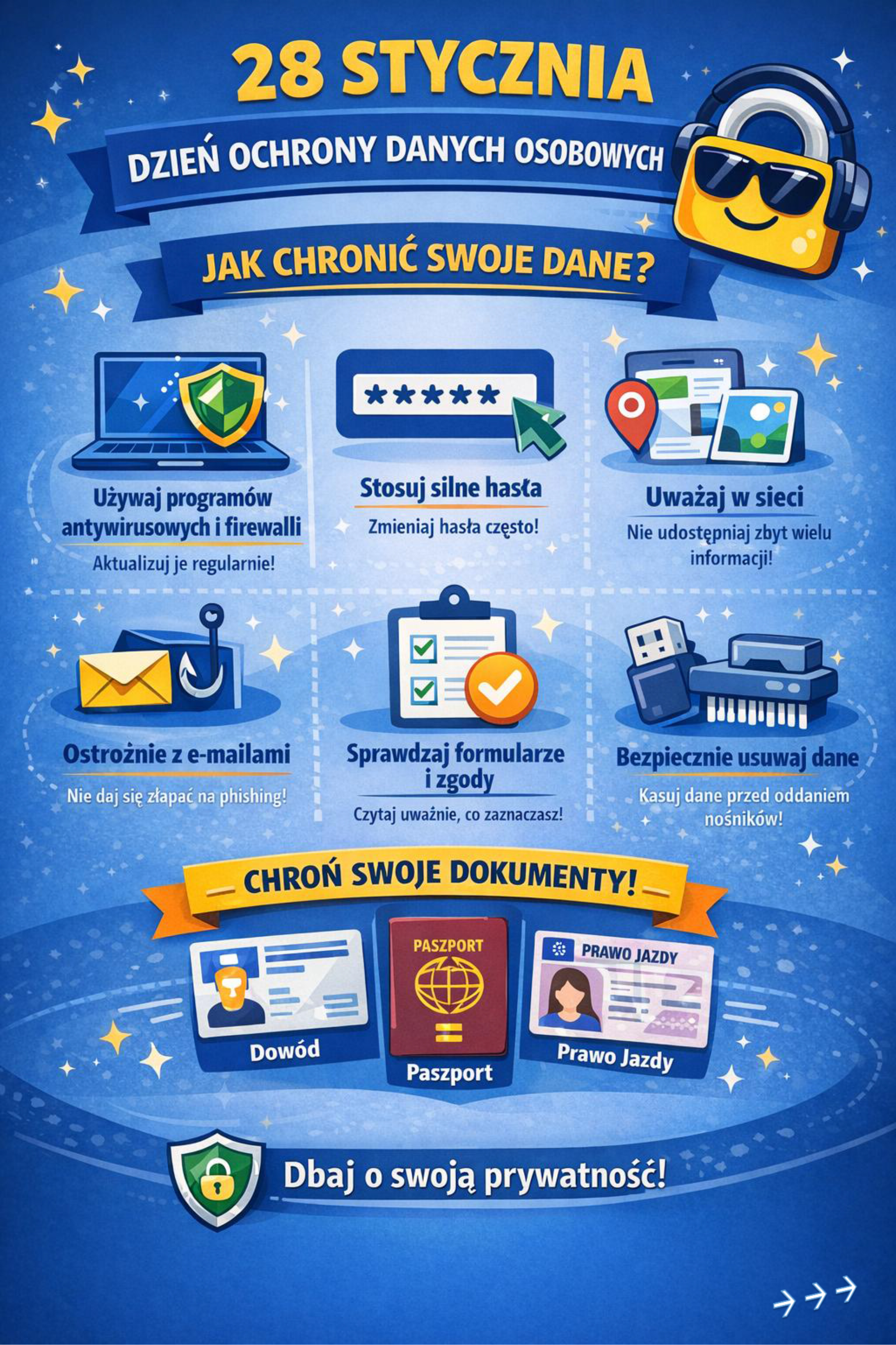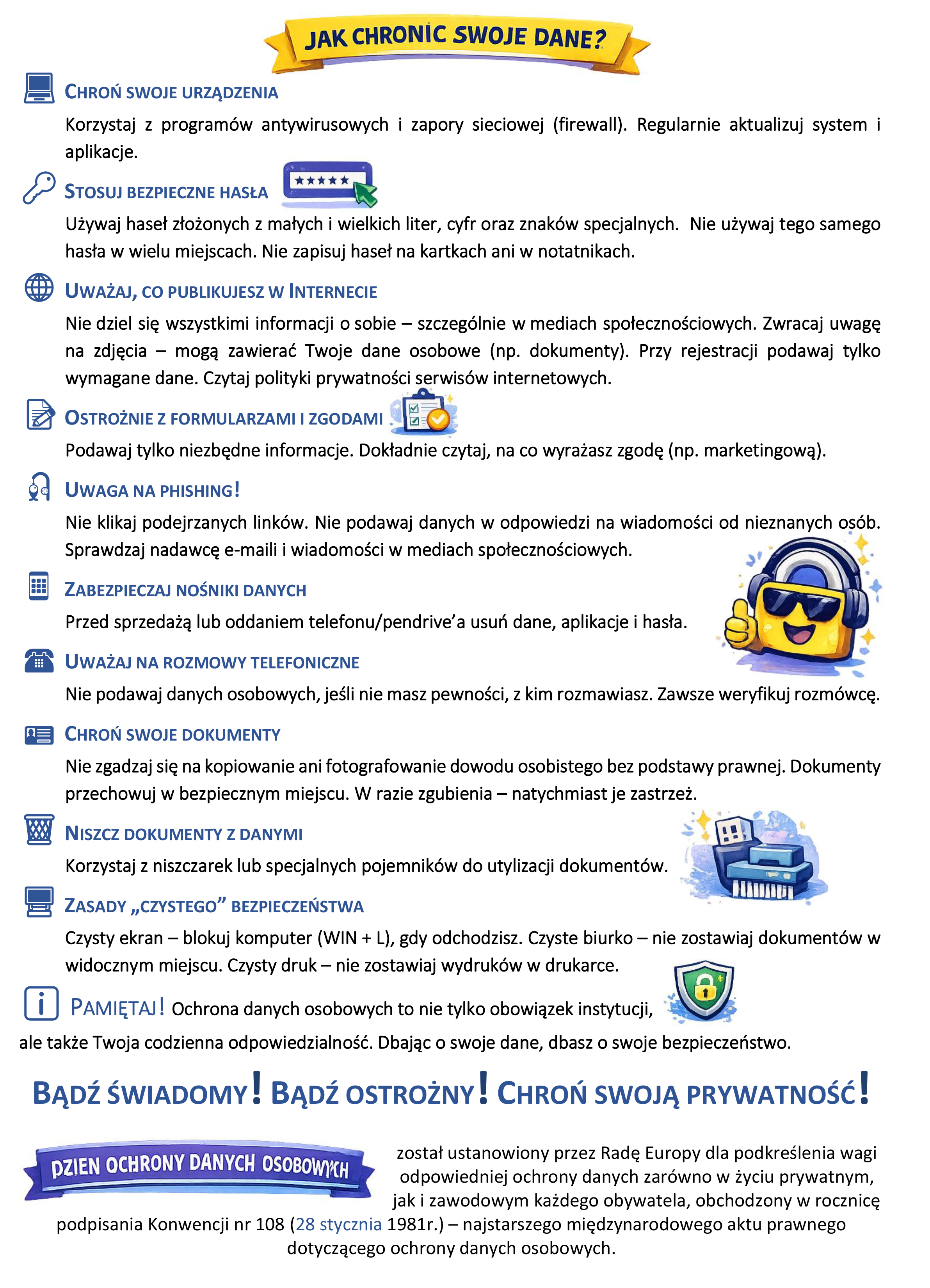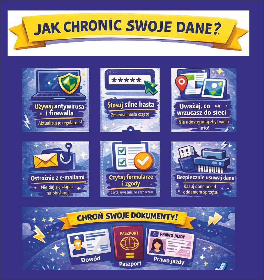 Obchodom Dnia Ochrony Danych Osobowych towarzyszyły również ulotki informacyjne, gazetka tematyczna i prezentacja multimedialna, których celem było poszerzenie wiedzy uczniów oraz zwrócenie uwagi na znaczenie ochrony prywatności we współczesnym świecie.